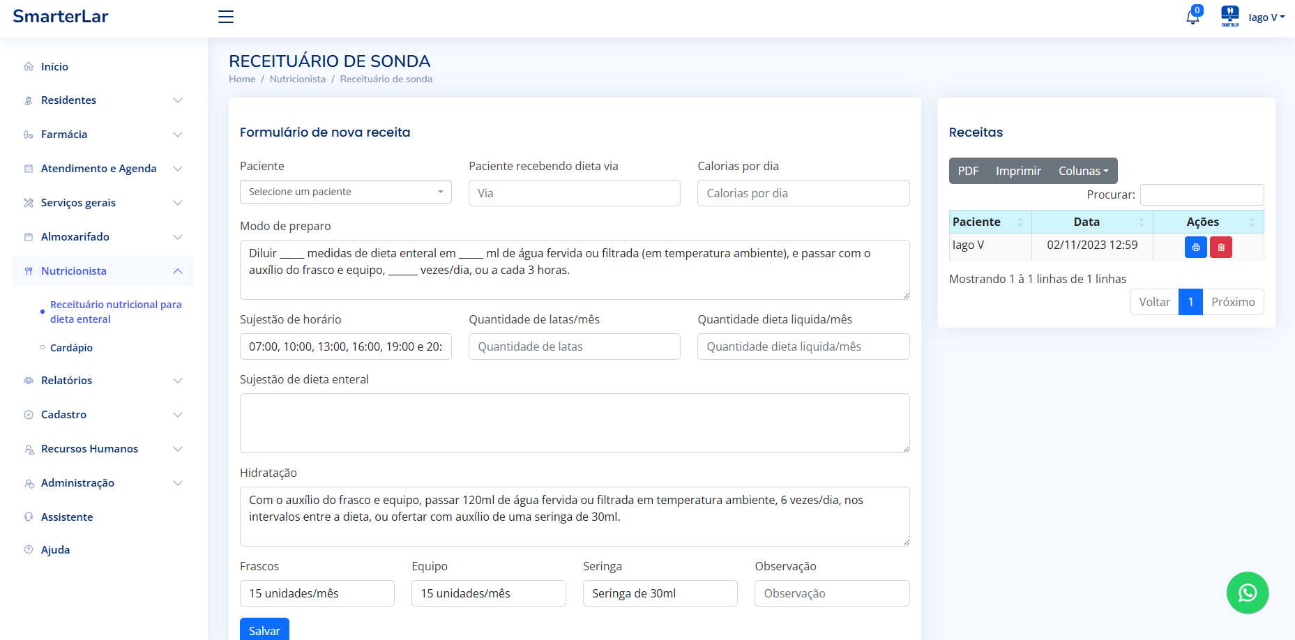 Gestão total da farmácia: controle de prescrições, estoque por residente e histórico de uso.